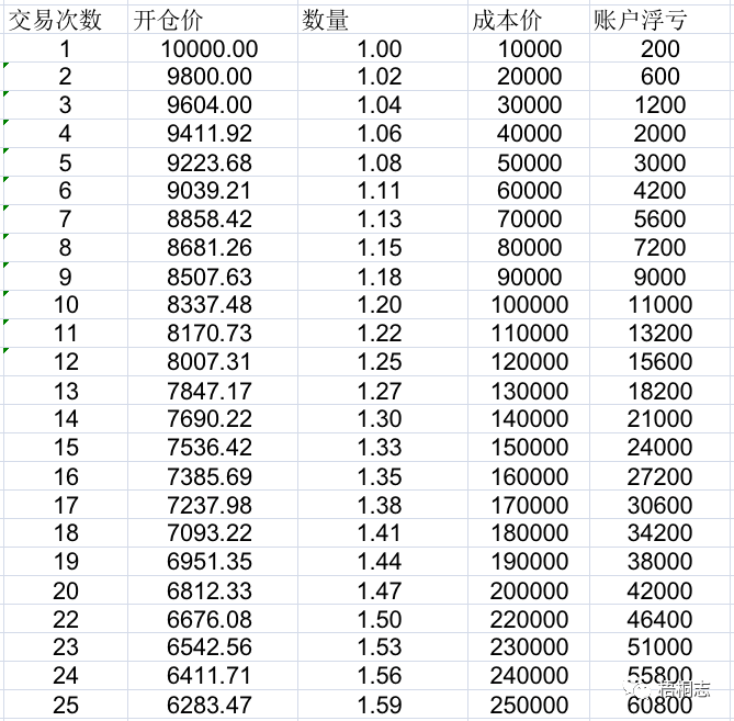 b、顺应趋势:网格交易感觉不需要判断趋势,只挣波动的钱,做多做空都行,这是最大的一个误区。如果我们一直做多,当行情一直下跌时,我们就会产生很多浮亏的订单无法平仓。当然你可以说这些浮亏会通过价格波动中的交易盈利稀释,我们用下图计算一下。