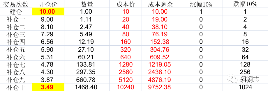 该次交易连续补仓10次,最终跌幅是65.1%;建仓成本价10U,第10次补仓需要5120U,是建仓成本的512倍。此时如果涨幅10%平仓,这次交易不亏不赚,如果又跌幅10%,下次补仓需要10240U。