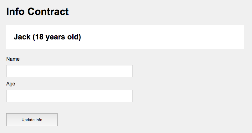 var info = InfoContract.at(PASTE CONTRACT ADDRESS HERE);完成这些我们就可以调用合约中的函数了,下面我们使用 jQuery 与我们的合约进行交互: