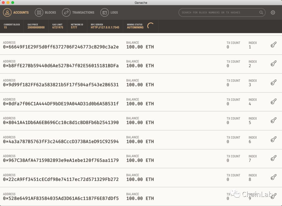 从图中可以看到Ganache会默认创建10个账户,监听地址是http://127.0.0.1:7545,可以实时看到Current Block、Gas Price、Gas Limit等信息。