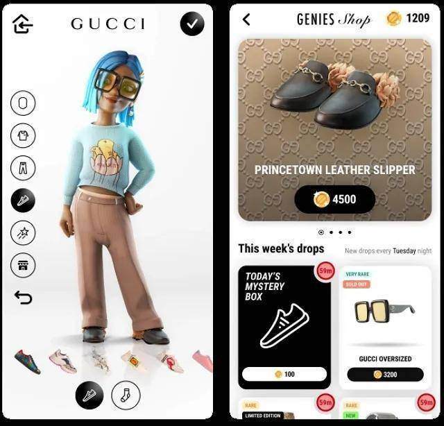 这种低付出带来高回报的逻辑也可以运用到很多娱乐社交产品当中,甚至借助着用户这一心理实现变现。这一点在虚拟社交上尤为突出。比如提供虚拟形象制作服务的公司「Genies」,去年与奢侈品牌「Gucci」合作,在其移动应用中上架了获得「Gucci」批准的虚拟产品。在「Genies」的移动应用中,这些「Gucci」的产品的售价要比现实中便宜很多。据「Genies」的 CEO Akash Nigam 介绍,因为 Z 世代群体在现实中买不起奢侈品牌,因此他们会更倾向于在虚拟世界中以低价购买「Gucci」。