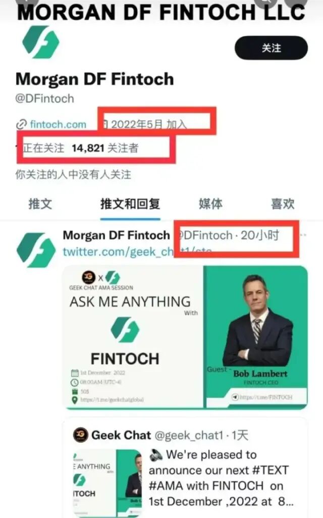 再仔细看粉丝数量,今年5月才建的,而且将近15000粉丝,一看就是买的僵尸粉,一条推特点赞仅有3个,就是为了收割韭菜用的。