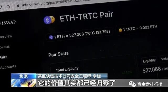 为了搞清TRTC币无法卖出的真正原因,记者来到了一家专门做区块链安全的技术公司。很快,技术人员监测到了TRTC的资金盘。没想到的是,曾经的百倍币,现在已经彻底成了空壳。