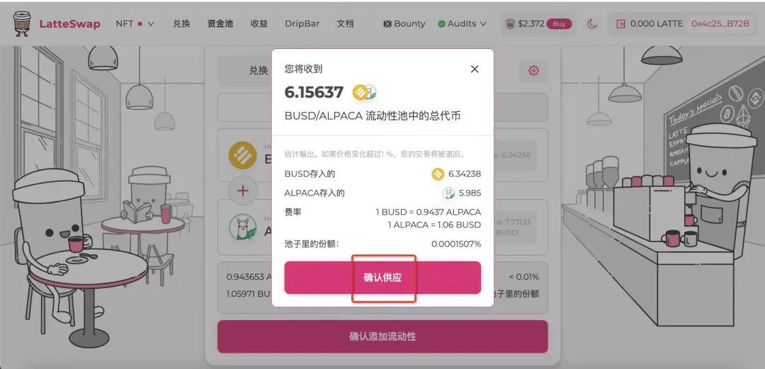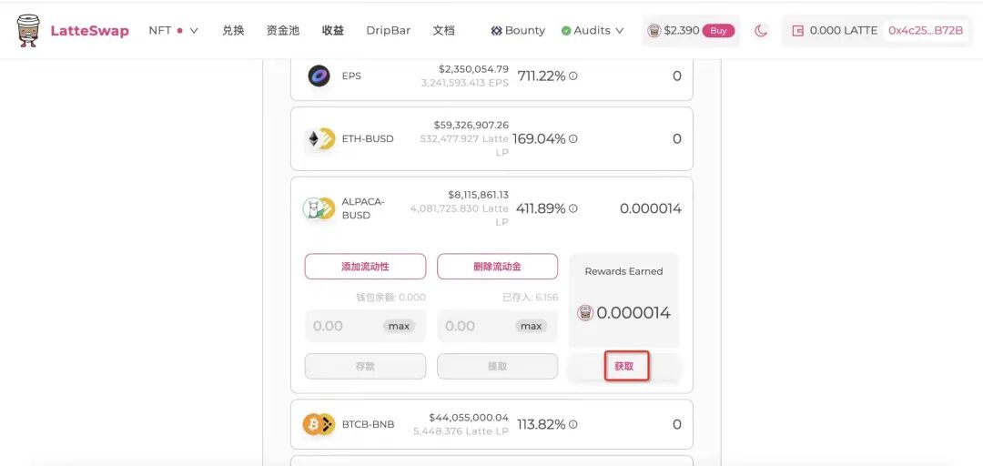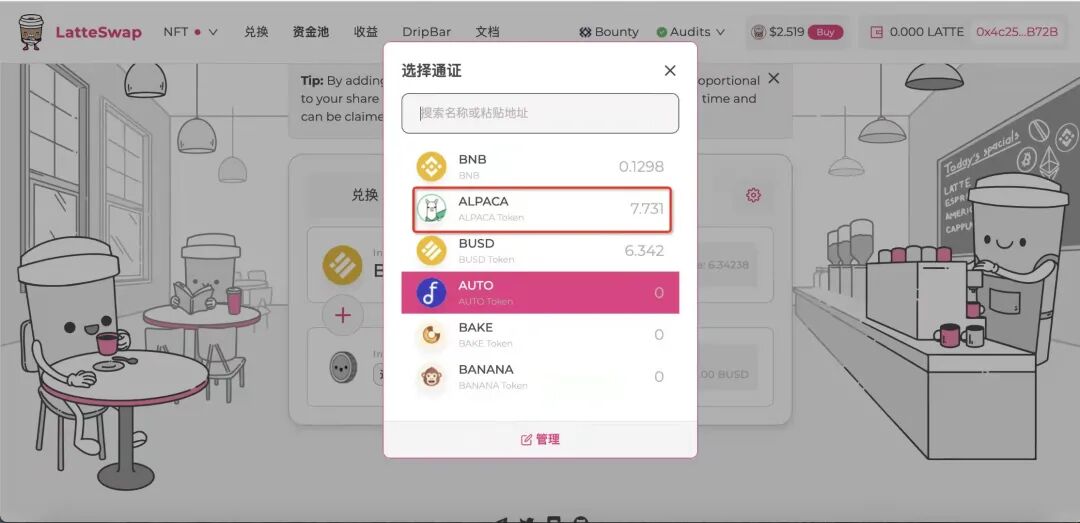 下面附上挖矿详细教程。本文将示范如何将Alpaca和Busd组成LP代币在LatteSwap上赚取流动性提供者收益。(注意:不一定非要用Alpaca组LP,BTC、ETH、bnb等都可以,具体可以参考收益页面各资金池的收益率)