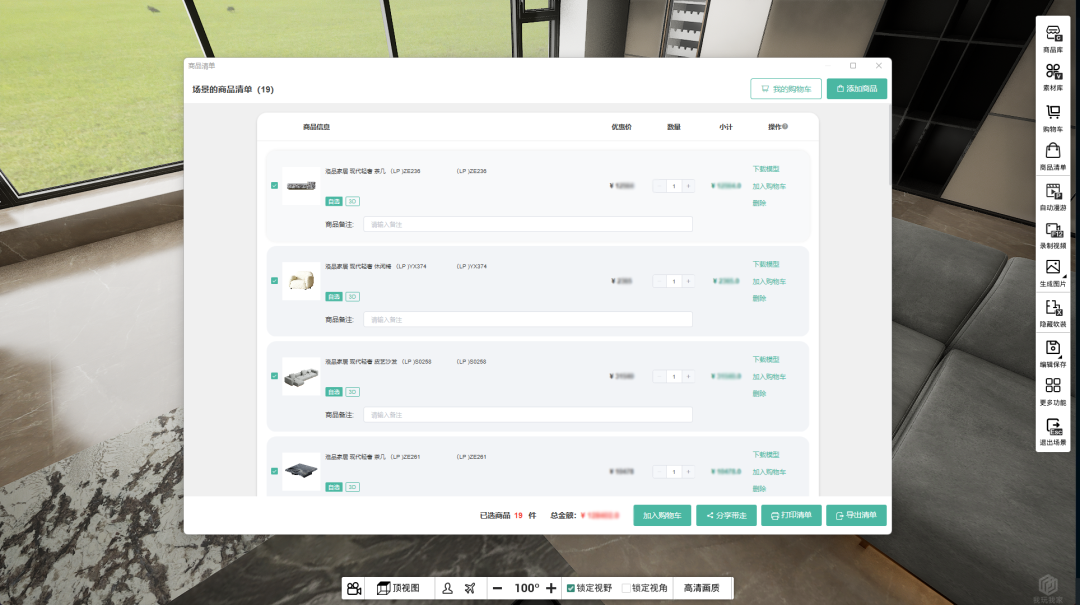 所有产品一键采购,“所见即所得” 软装采购是家居设计方案落地的重要环节。传统设计软件制作的效果图采用公模,真正采购起来存在困难。 而“南康城发·家居美学馆家居元宇宙营销系统”设计方案中所使用的软装产品可以一键生成订单,一键源头采购,确保软装产品高品质交付,质量服务有保障,整装效果直观呈现,真正做到设计方案“所见即所得”,助力家居企业整装转型升级与利润增长。此外,软装销售软件还可在内容生产、引流、设计、销售、采购、管理等环节中帮助提升300%~1000%的效率,实现家居行业数字化转型。 软装采购界面支持一键导出清单,方便快捷,提高了软装采购效率,缩短了交付时间。
